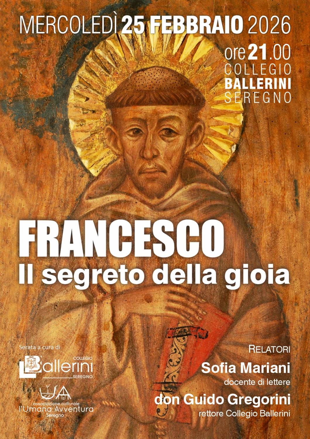 Il titolo della serata, Francesco: il segreto della gioia, ci offre già la chiave di lettura dell’evento. In un tempo spesso segnato dall’incertezza e dallo sconforto, vogliamo indagare la radice di quella letizia perfetta che ha contraddistinto la vita del Santo. Il Rettore, don Guido Gregorini ci guiderà nella conoscenza di San Francesco a partire da alcune domande fondamentali: Qual è il segreto di Francesco? Perché il mondo intero continua a guardare a lui?